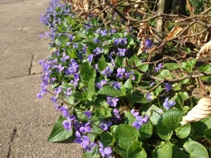 Deze paarse viooltjes bloeien nu onder de beukenhaag in de tuin. Ze zijn wel laat door het koude weer. Alles knalt nu uit de grond en in het blad. De natuur is bezig met een inhaalslag.