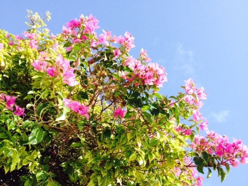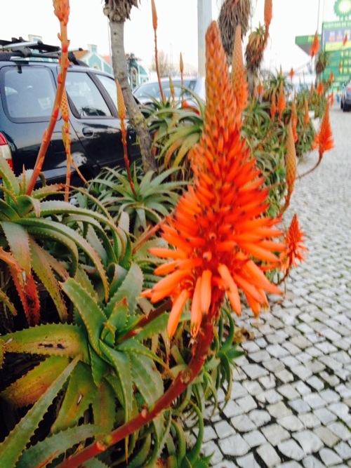 Verbazingwekkend: deze planten staan nu gewoon in bloei in december in Portugal. Bougainville en een soort vetplant, die bloeit nu met prachtige oranje bloemen in een perkje aan een drukke straat.