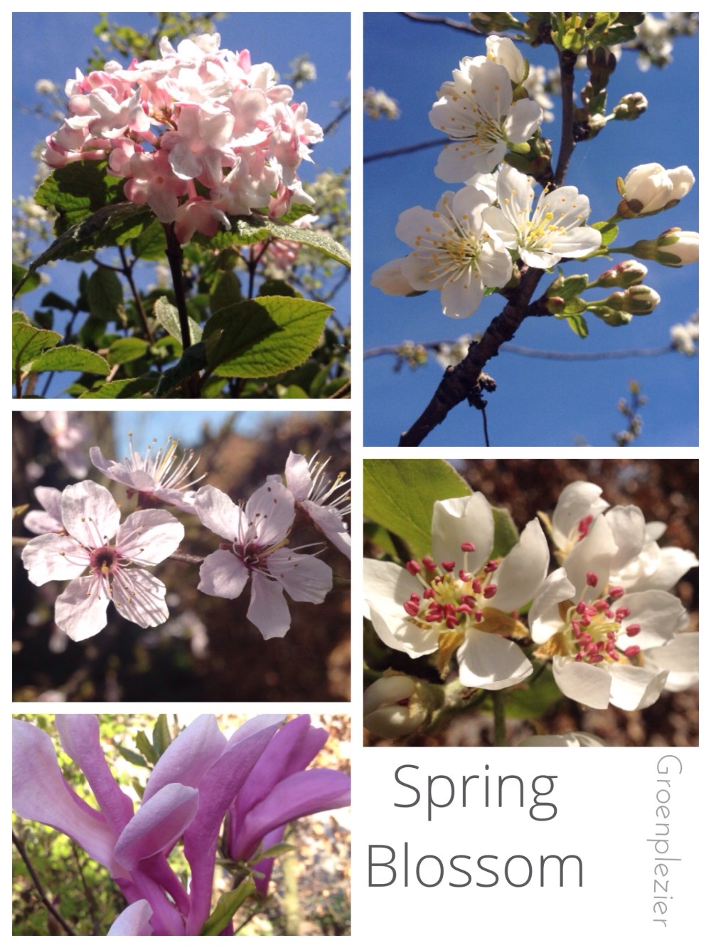 Alles wordt weer groen, de tuin verandert in rap tempo in een groene oase. Van links naar rechts: Vibernum (Sneeuwbal), Peer, Prunus, Kers en Magnolia.