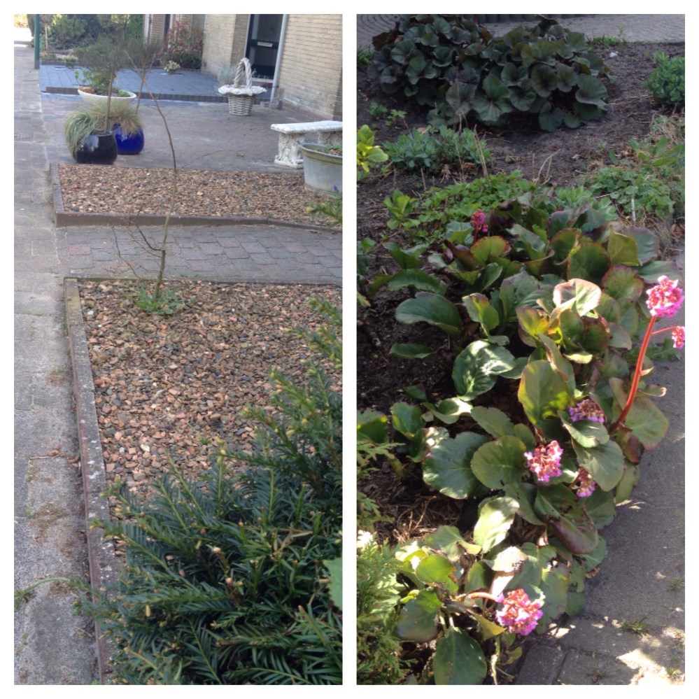 Dit bedoel ik – split-tuin of tegeltuin met her en der een verdwaalt plantje, betonnen beeldjes en zielige half verdorde plantjes in bloempot. Rechts zie je een border van iemand die er wel wat van heeft gemaakt in dezelfde huizenrij.